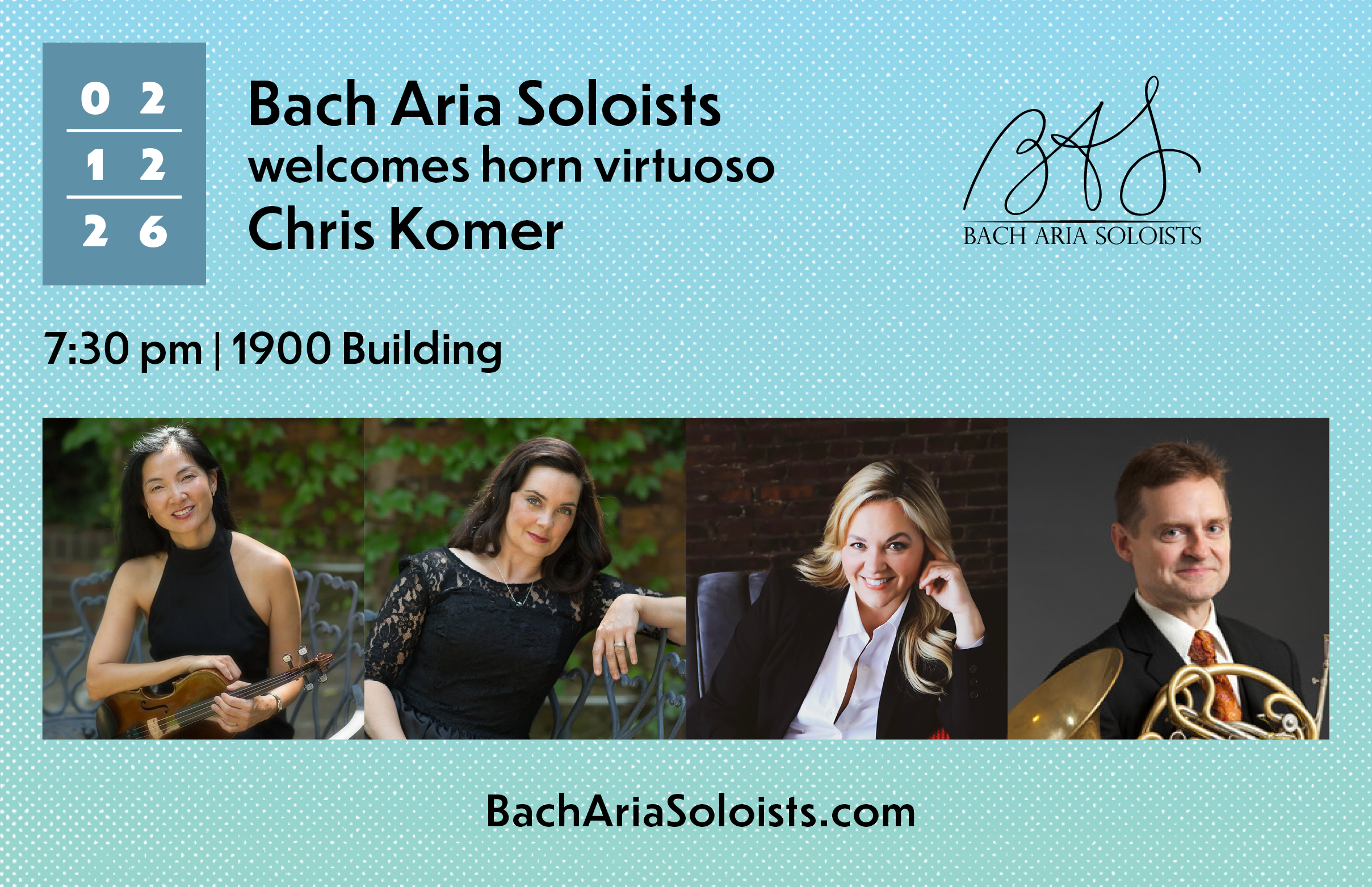 Bach Aria Soloists is elated to welcome hometown native Chris Komer back to Kansas City! Chris and Elizabeth Suh Lane met when they were students at the Tanglewood Music Center. Having built distinguished careers in music, they are reuniting for the first time in concert since Tanglewood. “Chris is a formidable musician—a world-renowned horn player and jazz pianist. I wanted to introduce his unparalleled talent to Kansas City with an expansive program of classics and soulful music that are pure Chris—Brahms Horn Trio, Schubert Auf dem Strom for horn, soprano and piano, along with original pieces from Komer’s solo piano album, Travlin’ Music (Folk songs, ballads and improvisations) showing Chris thoroughly in his element. Plus, a 21st c. piece for horn, violin and piano composed for Chris by composer Vivian Li called White Moose Crossing.” Elizabeth Suh Lane